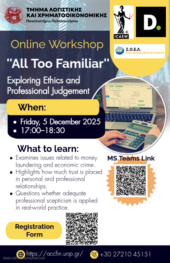 Το Τμήμα Λογιστικής και Χρηματοοικονομικής του Πανεπιστημίου Πελοποννήσου, σε συνεργασία με το Ινστιτούτο Ορκωτών Λογιστών της Αγγλίας και της Ουαλίας (ICAEW) και τη Deloitte, έχει την ευχαρίστηση να σας προσκαλέσει σε ένα διαδραστικό διαδικτυακό εργαστήριο με θέμα την εκπαιδευτική ταινία του ICAEW «All Too Familiar». Η δράση θα πραγματοποιηθεί την Παρασκευή 5 Δεκεμβρίου και ώρες 17:00-18:30. Μετά την προβολή της ταινίας, θα ακολουθήσει συζήτηση με συντονίστρια την κα Fay Prokopi, Assistant Manager, Audit, Deloitte, η οποία θα μοιραστεί πρακτικές γνώσεις από την επαγγελματική της εμπειρία.